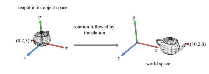 위 사진의 왼쪽부터 모델 공간(object space)에서 모델 변환(world transform)을 거쳐